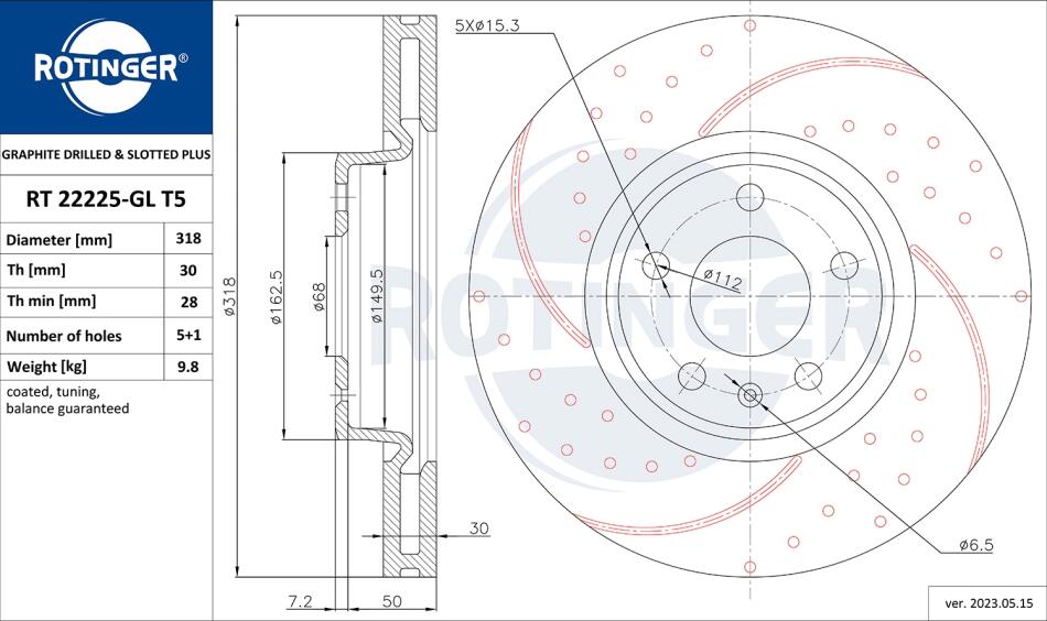 Диск тормозной передний (кратно 2) AUDI A4 (B9), A6 (C8), Q5 (18-) [318X57 перфо ROTINGER RT22225GLT5