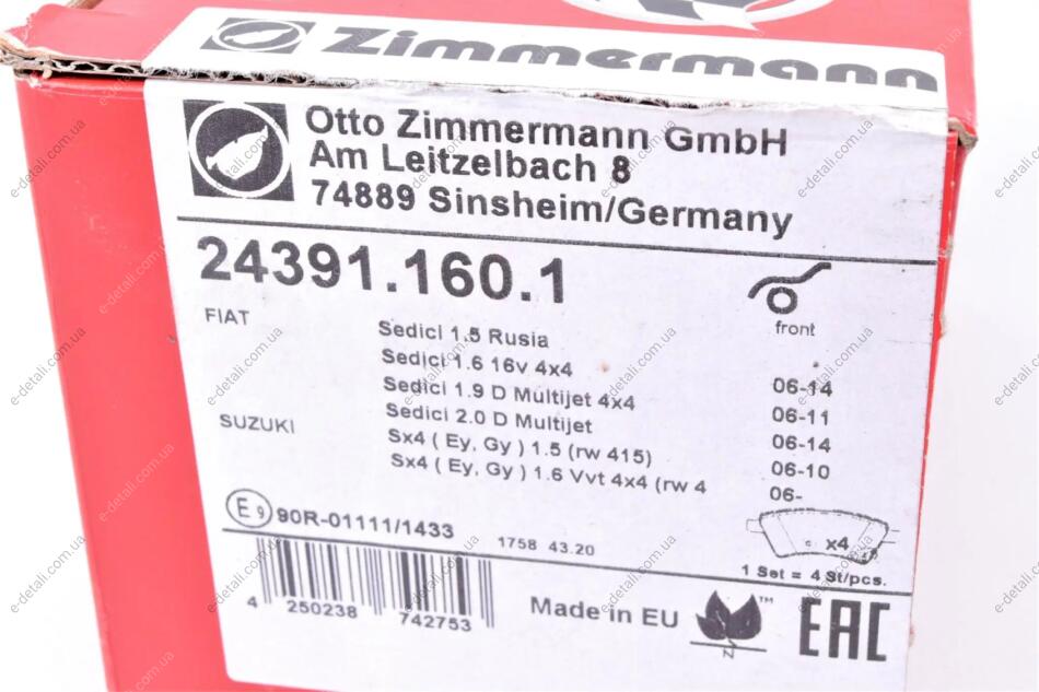 Колодки тормозные (передние) Fiat Sedici/Suzuki SX4 06- (Lucas) ZIMMERMANN 243911601