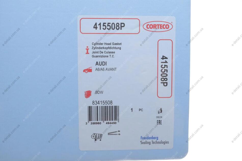 Прокладка ГБЦ Audi A6 2.4 04-08 (1-3 циліндр) CORTECO 415508P