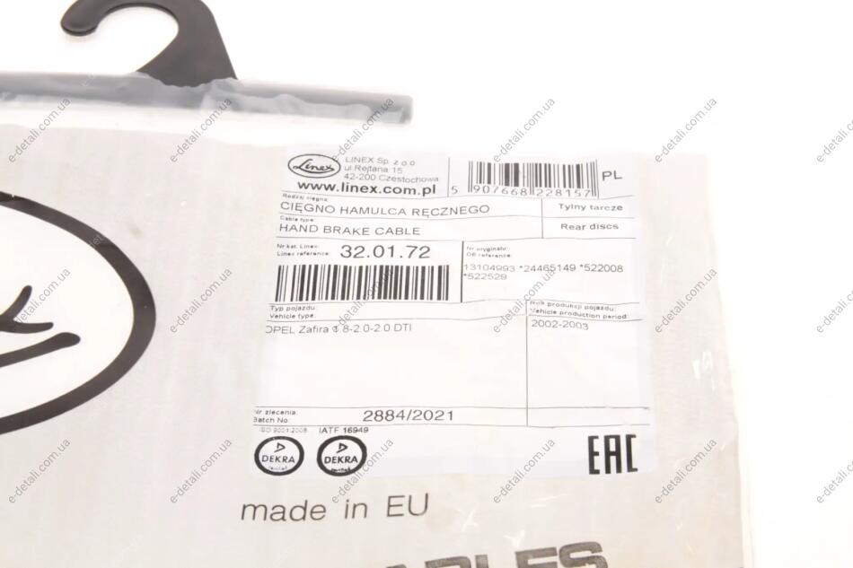 Трос ручника (задній) Opel Zafira 1.6-2.2 00-05 (1680/1495+1495mm) LINEX 32.01.72