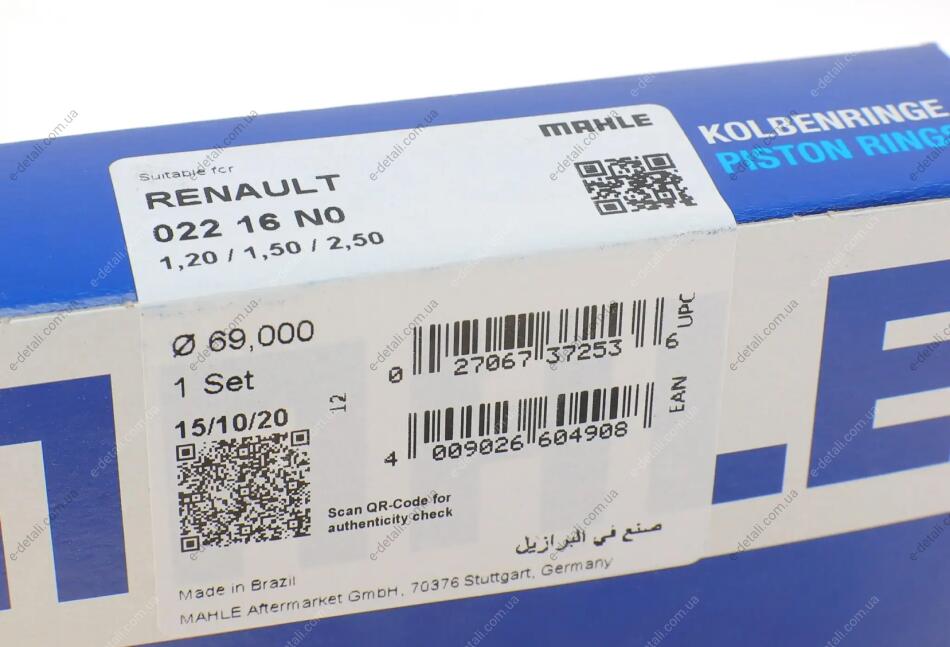 Кільця поршневі Renault Clio 01-/Sandero II 15-/Logan (D4F) 1.2 13- (69.0mm/STD) (1.2-1.5-2.5) MAHLE / KNECHT 022 16 N0