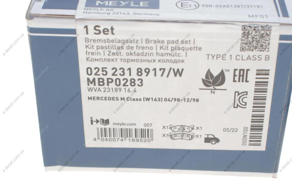 Колодки гальмівні (задні) MB M-class (W163) 98-05 MEYLE 025 231 8917/W